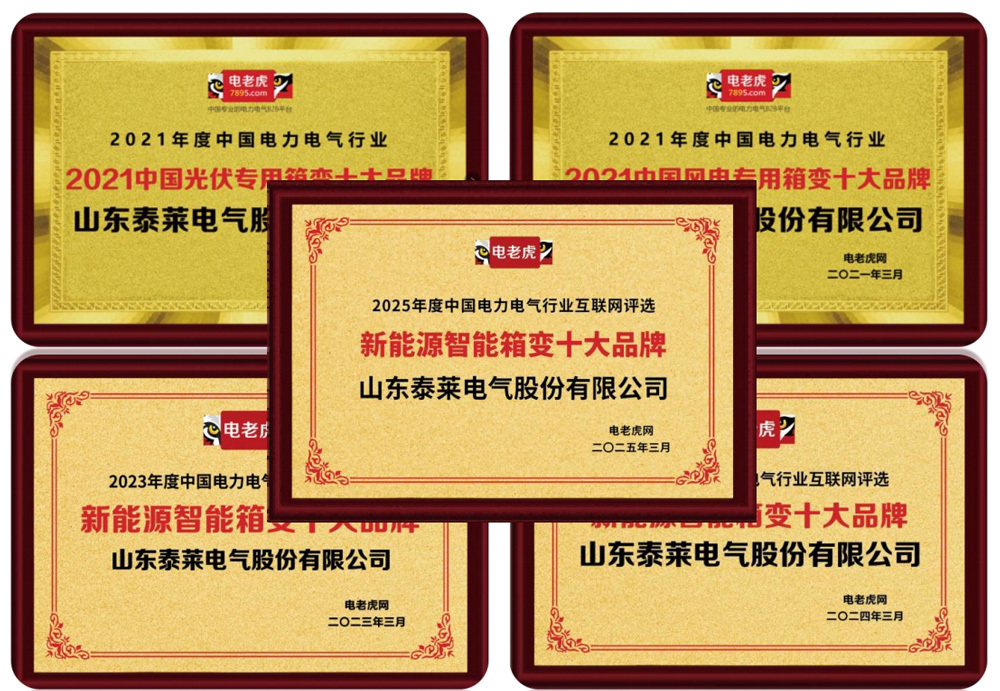 “S13-M-315/10油浸式电工钢带配电变压器”列入《国家工业节能技术装备推荐目录》; “组合式节能变压器生产绿色关键技术开发系统集成项目”列入山东省绿色制造项目库; “环保节能型全自动静电喷涂柔性生产线”和“高效节能智能控制柱上变压器”列入《山东省重点节能技术、产品和设备推广目录》; 在2021年度至2025年度中国电力电气行业“十大品牌”系列评选活动中,先后获得“中国风电专用箱变十大品牌”“中国光伏专用箱变十大品牌”和“新能源智能箱变十大品牌” |