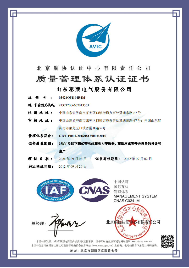质量管理体系认证证书