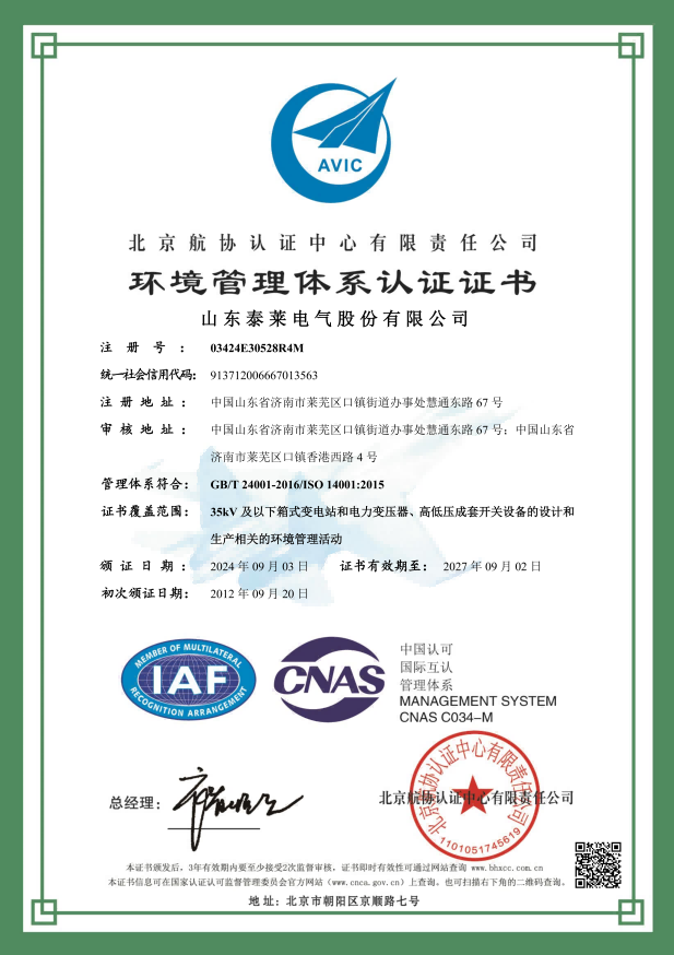 环境管理体系认证证书