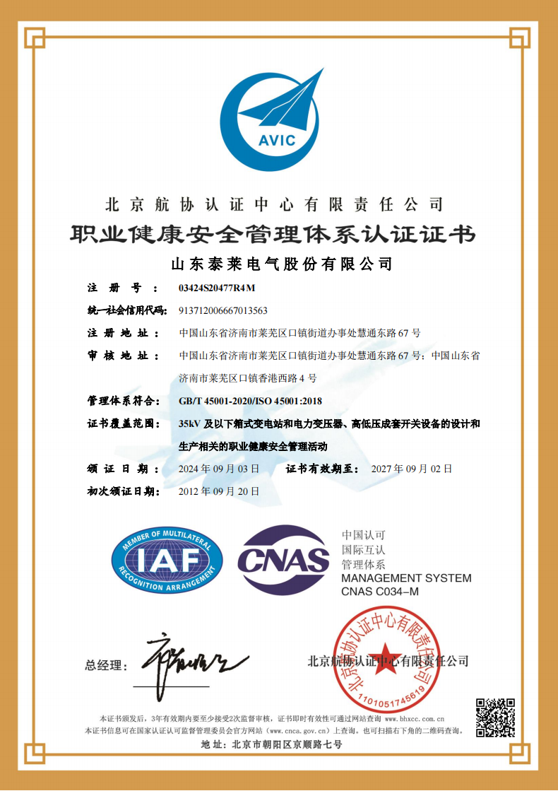 职业健康安全管理体系认证证书
